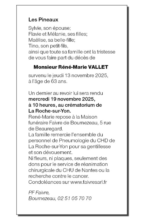 Décédé à La Roche-sur-Yon (85000, France) le jeudi 13 novembre 2025 à l'âge de 63 ans