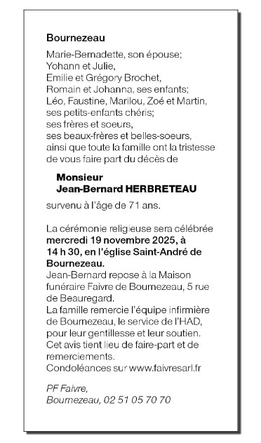 Décédé à Bournezeau (85480, France) le samedi 15 novembre 2025 à l'âge de 71 ans